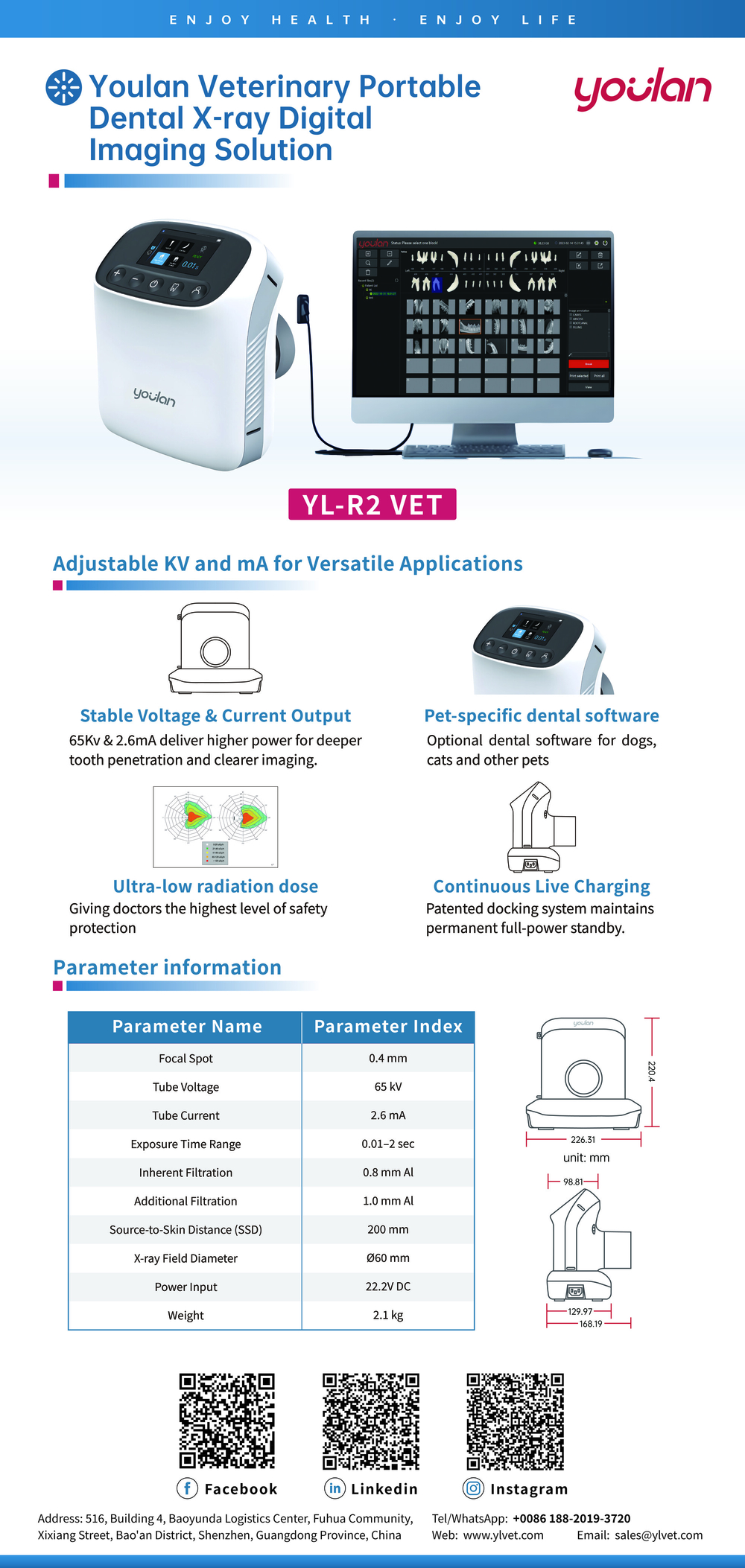 Le YLR2-VET est un système de radiographie dentaire numérique portable basé sur la technologie DR (Radiographie Directe), conçu pour la pratique vétérinaire. Il fournit des images numériques haute résolution en quelques secondes, sans cassette ni traitement CR, améliorant ainsi la rapidité des diagnostics et l’efficacité du flux de travail. Sa conception compacte et légère le rend idéal pour une utilisation dans plusieurs salles de traitement.
